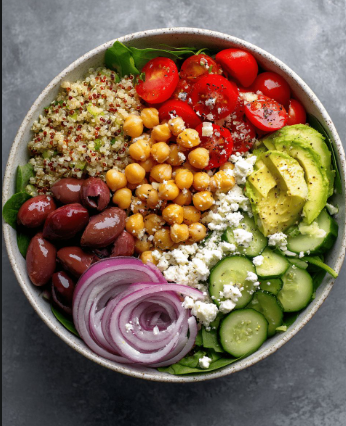 Inspired by Mediterranean cuisine, this lunch is light, fresh, and deeply satisfying. It emphasizes lean protein, healthy fats, and vibrant vegetables.