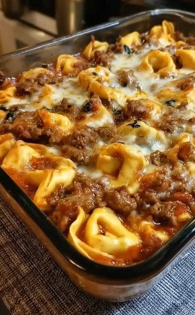 3. Mix in Pasta: In a large bowl or directly in a greased 9×13 inch baking dish, toss the uncooked refrigerated tortellini with the meat sauce until every piece is well-coated.