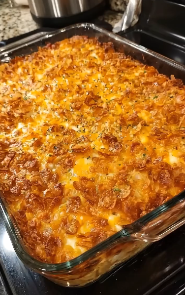 - Crunchy Topping: In a small bowl, toss the crushed cornflakes with the remaining 1/4 cup of melted butter. Spread this in an even, thick layer over the casserole.