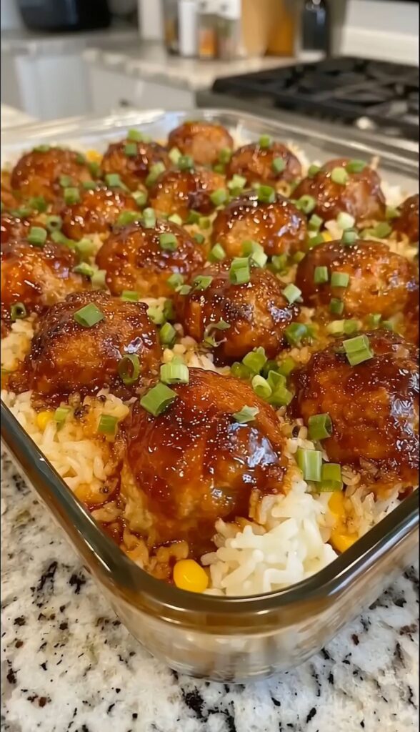 Honey Garlic Meatball Rice Bake