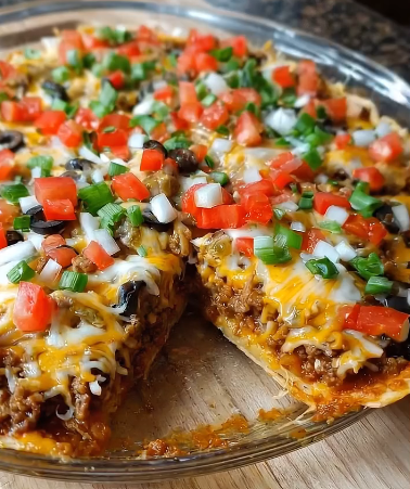 4. The Pizza Top: Place a second crispy tortilla on top of the beef layer. Spread a thin layer of enchilada sauce over the top tortilla.